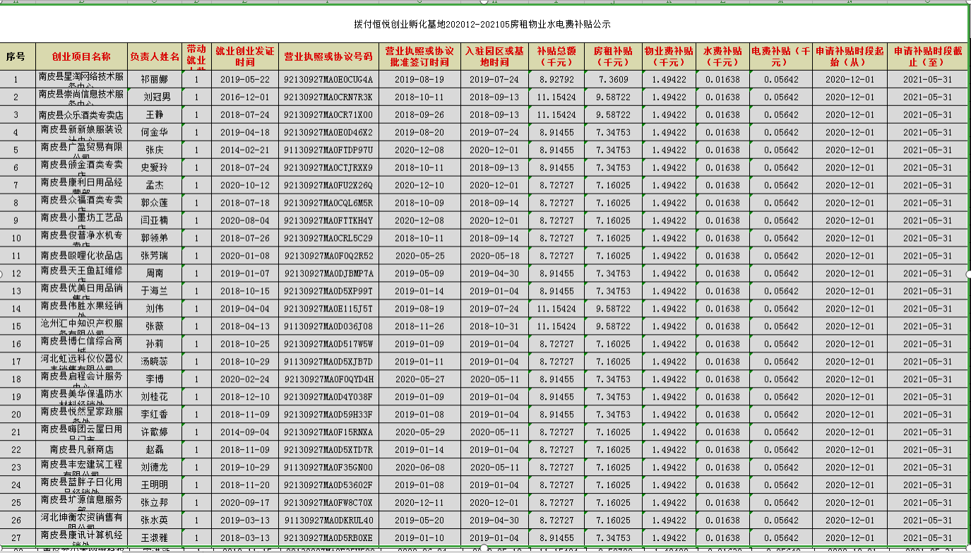 拨付恒悦创业孵化基地202012-202105房租物业水电费补贴公示