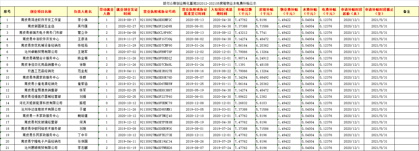 拨付众帮创业孵化基地202012-202105房租物业水电费补贴公示